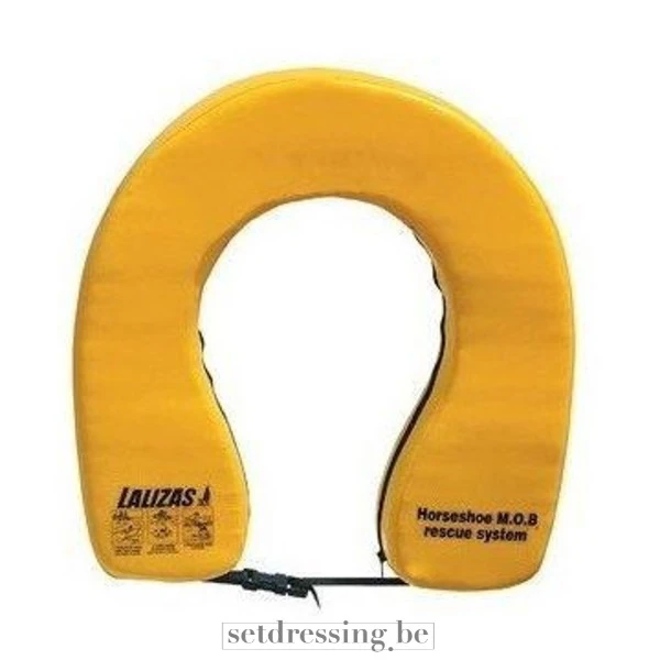This is a yellow, horseshoe-shaped lifebuoy, a common rescue device on ships. The object is made of durable, water-resistant textile filled with buoyant material, ensuring flotation. Its bright yellow color enhances visibility on water. A thin, black line is attached to the bottom. Texts and icons from "LALIZAS" and "Horseshoe M.O.B. rescue system" are printed on it. This lifebuoy is suitable as a prop for maritime scenes, simulations, or nautical-themed events.