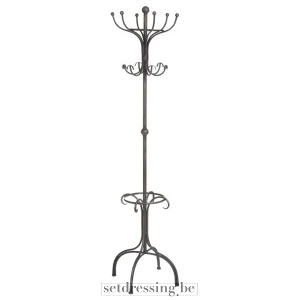 Black metal coat rack, 192 cm tall, with multiple hooks at different heights. This classic standing coat rack is ideal for hanging coats, hats, scarves, and umbrellas. The sturdy metal frame offers great stability and durability, perfect for entryways, offices, or use as a prop on film and photo sets. Its timeless design fits into a variety of interior styles, from industrial to traditional.