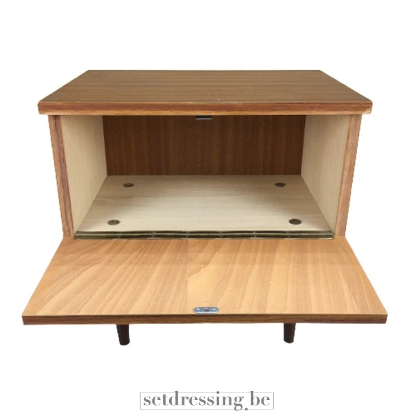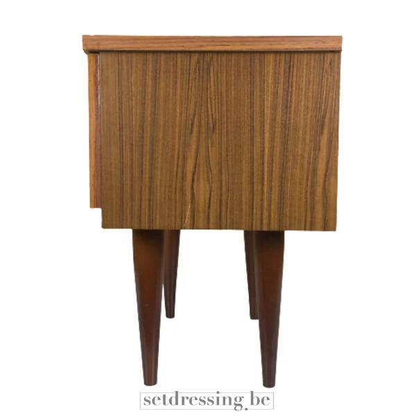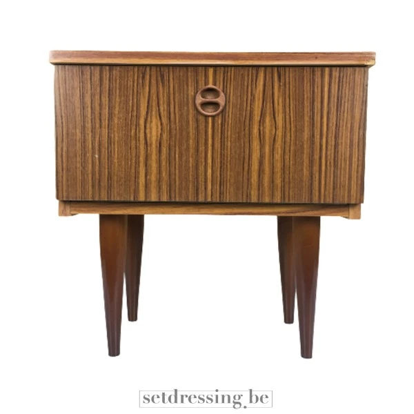 Classic bedside table, 53 cm high, finished in warm brown wood veneer. This elegant nightstand features a drop-down door with a round wooden handle, perfect for storing small items out of sight. The cabinet stands on four tapered legs, giving it a charming vintage look. Ideal as a nightstand next to the bed or as a compact side table in a living room or office. Durable construction suitable for indoor use.