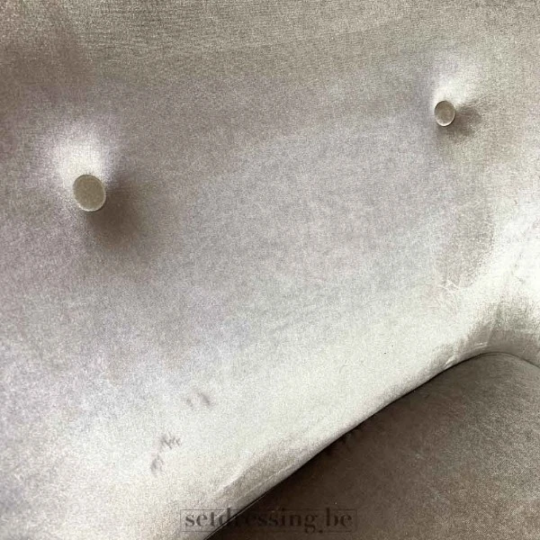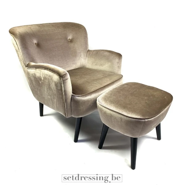 This is a gray velvet armchair with a matching footstool. The armchair features a button-tufted backrest and rounded armrests. The upholstery is a soft gray velvet fabric. The chair and footstool are supported by dark, tapered wooden legs. The armchair is designed for comfortable seating and provides a stylish accent to any interior. The footstool offers additional support and can be used as a separate seating option. The set is suitable for photo shoots, film sets, or event staging. The armchair measures approximately 80cm in height.
