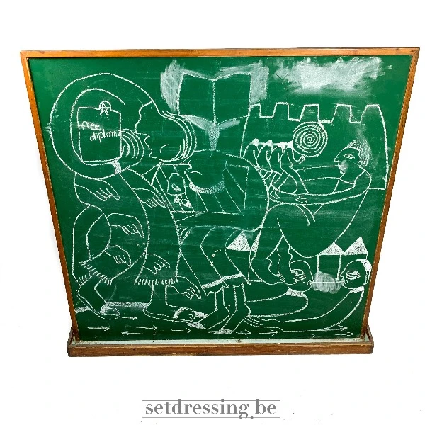 This is a large vintage chalkboard with a green surface and wooden frame. The chalkboard has a sturdy, classic look, ideal as a decorative prop in classrooms, film sets, photoshoots, or events. The wooden frame provides stability and adds a warm, nostalgic touch. Suitable for indoor use and perfect as a blackboard or display board on set.