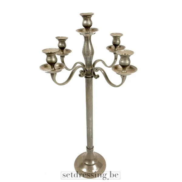 This is an antique brass candle holder with five arms. The candlestick is made of brass and has a silver-colored finish. It has a central stem with five arms, each holding a candle holder. The candlestick has a round base and a classic, elegant design. Suitable for decorative purposes in sets requiring a historical, luxurious, or atmospheric context.