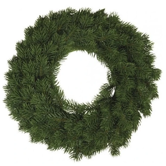 This is an artificial pine wreath. The wreath is made of dark green, synthetic needles. It has a round shape and is designed to be hung on a wall or door. This decorative piece is suitable for interior sets, events, and photoshoots, especially for seasonal or festive scenes. It requires no maintenance and adds a natural, green element to the space.