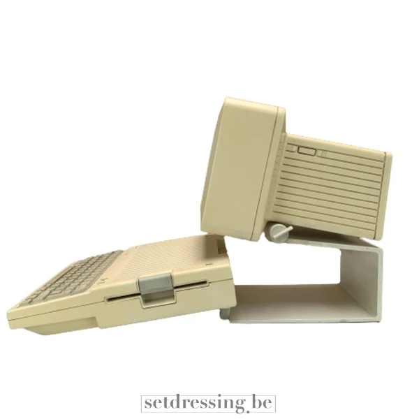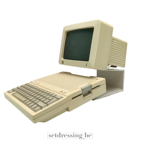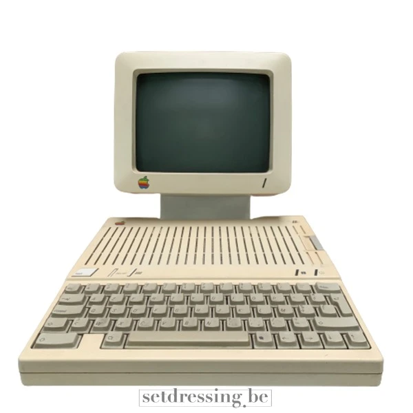 This is a vintage Apple IIc personal computer setup, featuring an integrated off-white keyboard and a separate matching CRT monitor. The system includes the iconic rainbow Apple logo. Both units are constructed from durable plastic, reflecting the design aesthetic of the mid-1980s personal computing era. This prop is ideal for creating historically accurate office, classroom, or home computing scenes for film, television, photo shoots, or themed events. Its distinct design and branding provide a strong sense of authenticity and nostalgia for period-specific productions.