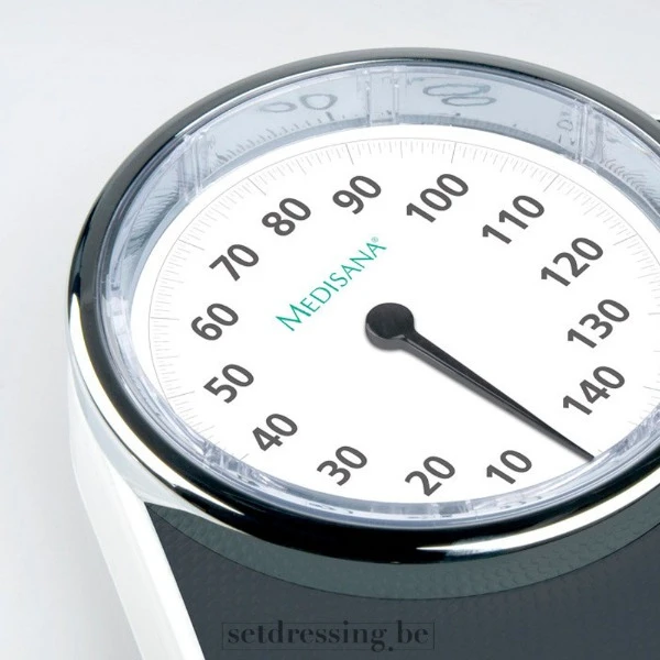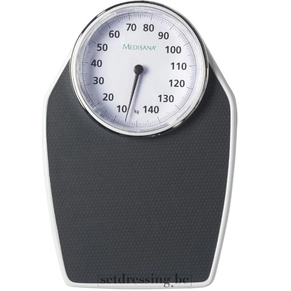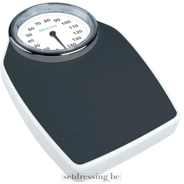 This is an analog personal scale with a retro appearance. The weighing surface is dark grey with a non-slip texture and the rim is white. The scale features a large, round dial display with black numbers and a black pointer on a white background. The measuring range is up to 140 kg in 1 kg increments. This functional prop is ideal for scenes related to health, fitness, or a classic domestic atmosphere. It is a recognizable object for various productions.