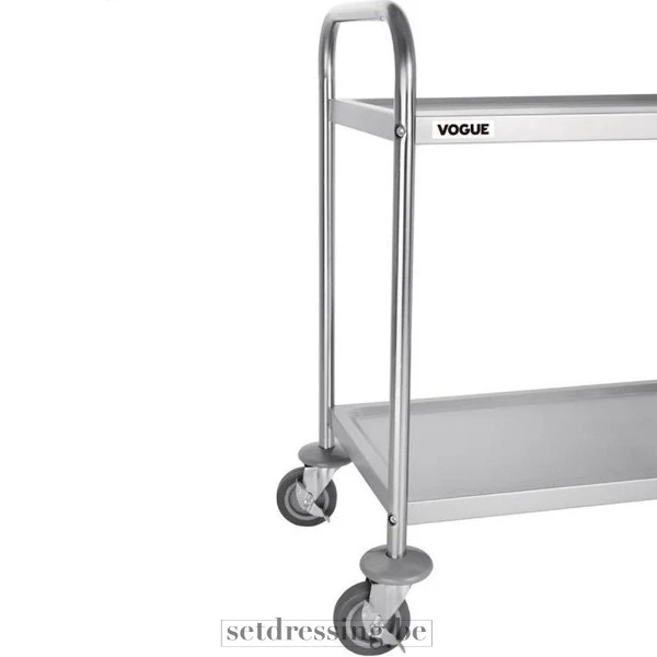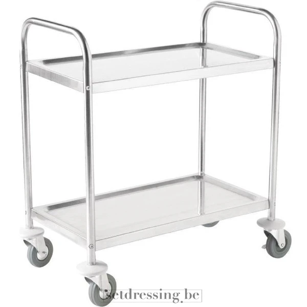 Stainless steel hotel trolley, 90 cm wide, with two sturdy shelves for easy transport of dishes, supplies, or other items. Equipped with four smooth-rolling wheels, two of which feature a brake system for extra stability. The sleek stainless steel design provides a professional look and is easy to clean. Ideal for catering, events, or other professional settings. Suitable for both indoor and outdoor use.