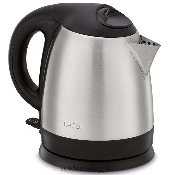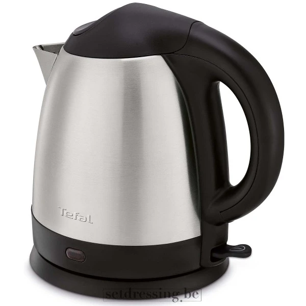 This is a modern electric kettle, likely a Tefal Compact model, designed for contemporary kitchen settings. It features a brushed stainless steel body with contrasting black plastic accents on the handle, lid, and base. The kettle has a sleek, functional design with a concealed heating element and a 360-degree rotational base. Ideal for various productions, this appliance fits seamlessly into modern home, office, or breakroom scenes. Its durable construction of stainless steel and plastic ensures it is a reliable and visually appropriate prop for film, photography, and event staging.