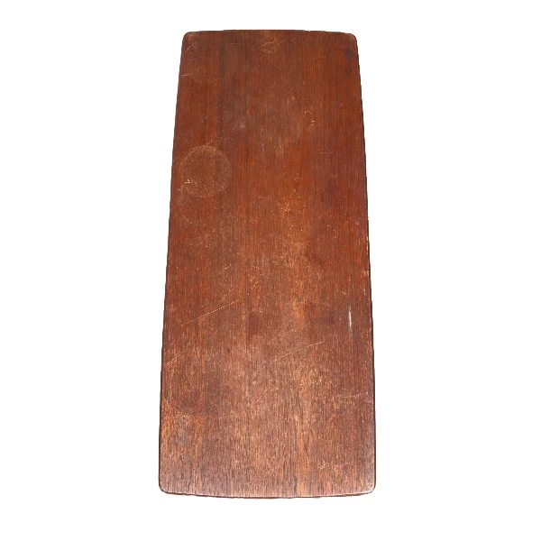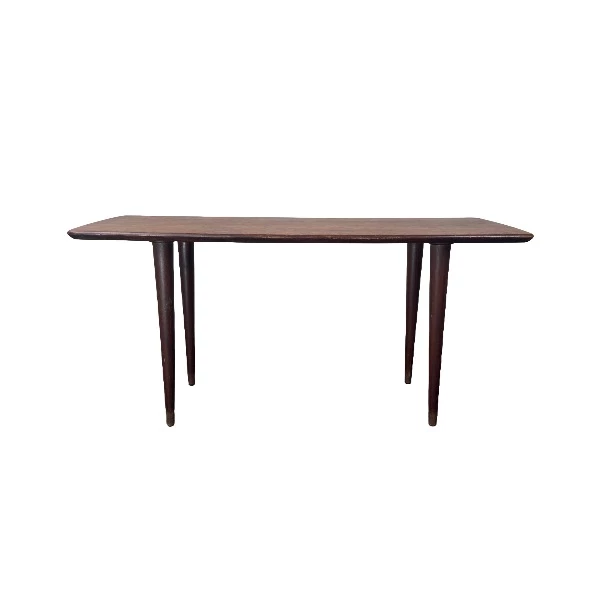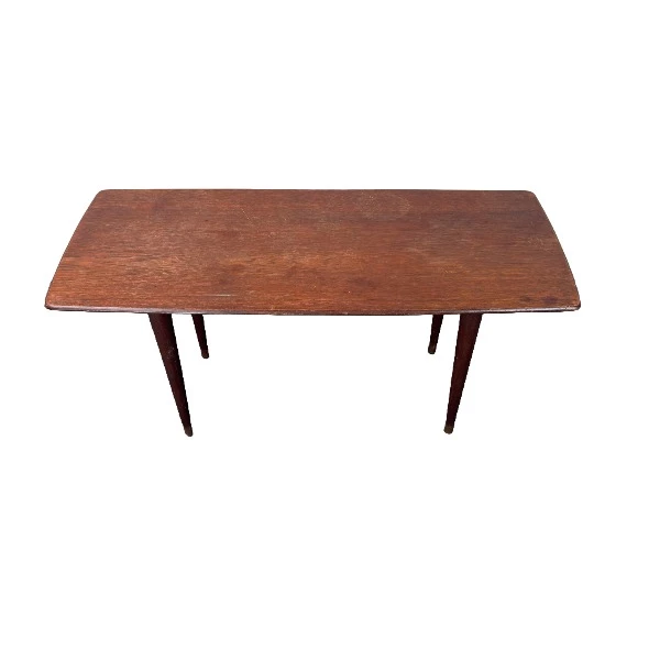 Dark brown wooden side table, measuring 98cm by 41cm. This minimalist table features a smooth wooden surface with tapered legs, giving it a mid-century modern look. Sturdy and elegant, it is perfect for use on film sets, photoshoots, and event styling. Designed for indoor use.