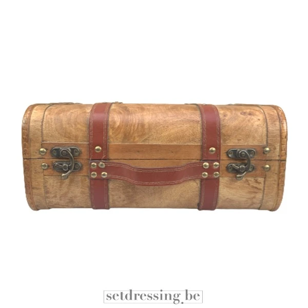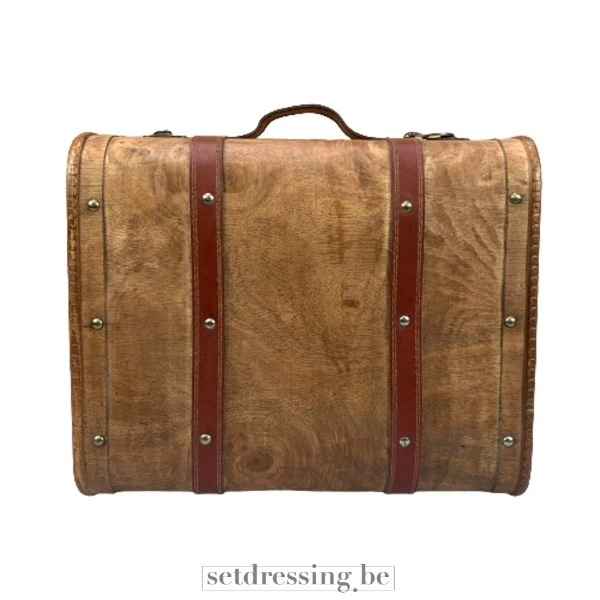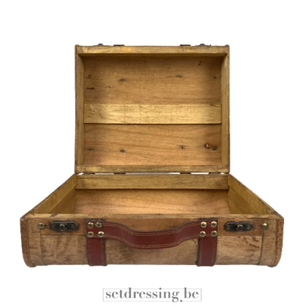 This is a vintage wooden suitcase with leather straps and metal accents. The suitcase is crafted from light brown wood with a visible grain. The two vertical straps are made of dark brown leather, and the edges are reinforced with rounded wooden strips. Brass-colored metal rivets are visible along the edges and straps. This object is ideal for creating a historical travel, adventure, or storage scene. It is an authentic prop that adds character to various productions.
