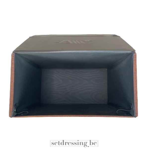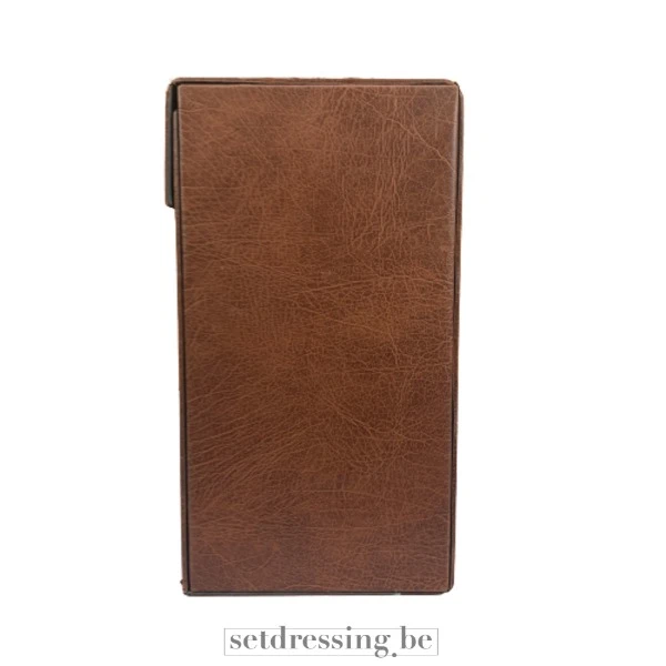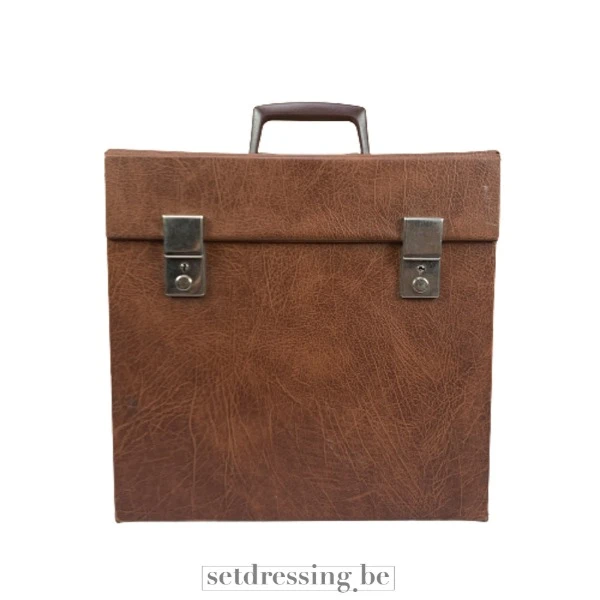 This is a vintage brown record case. The case is made of brown faux leather with a lightly textured surface and has a rectangular shape. The handle is a darker color. Two silver-colored metal clasps adorn the front of the case. This object is ideal for creating a retro atmosphere in scenes related to music, travel, youth, or general nostalgia. It is a recognizable prop for various productions.