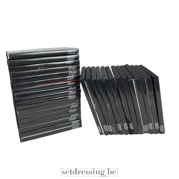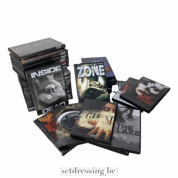 This is a collection of approximately 30 royalty free DVD cases, primarily for horror-themed films. The cases are standard plastic DVD cases, predominantly black, with various graphical covers featuring eerie and suspenseful imagery. Some titles visible include "Inside," "Dead," "Zone," "Ghost," "The Lake," and "The Fear,". This prop set is ideal for creating realistic home entertainment setups, video store scenes, or personal collections in film, photo shoots, or themed events. Its thematic consistency makes it a versatile prop for genre-specific productions. These are author rights free.