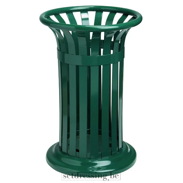 This is a green metal waste bin in a classic vase shape. The waste bin is constructed from vertical metal slats with two horizontal bands for reinforcement. The color is a dark green, glossy finish. The base is closed and widely flared for stability. This object is functional and decorative, ideal for public spaces, parks, schoolyards, or as a background detail in various outdoor or interior scenes. A timeless prop for productions requiring a tidy or classic atmosphere.