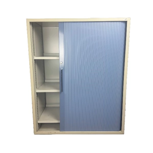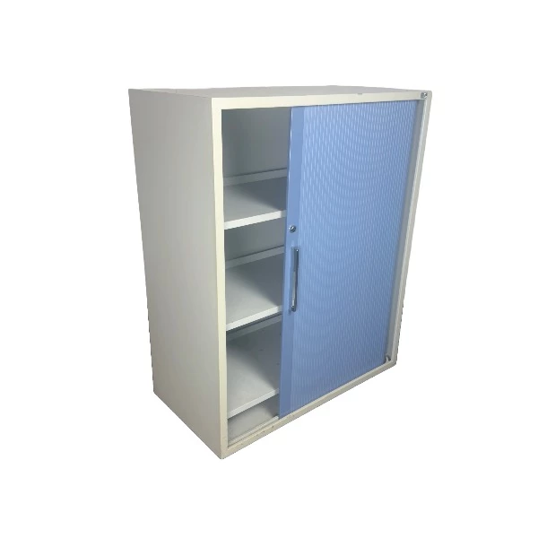 This is a metal storage cabinet with a sliding door and multiple shelves. The cabinet has a light blue finish and is suitable for use in film sets, photo shoots, and events.