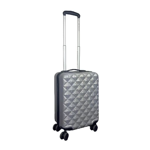 This is a grey compact carry-on suitcase with four wheels and an extendable handle. The suitcase is made of hard plastic with a complex, three-dimensional pattern of facets or triangles on the exterior. The handle is silver-colored metal with a black grip. The four swivel wheels ensure easy maneuverability. This suitcase is suitable for travel, airport, or vacation scenes and serves as a modern and functional prop for various productions.