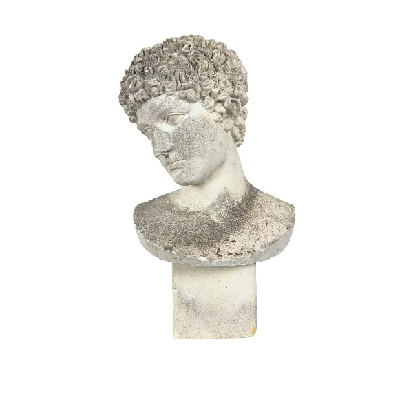 This is an antique bust, made of plaster. The sculpture depicts the head and upper chest of a man with curly hair, in a classical Greek or Roman style. The surface shows signs of weathering and patina, giving the bust an authentic, aged appearance. The color is off-white to light grey, with darker stains indicating wear or dirt accumulation. This object is suitable as a decorative element for historical, artistic, or stately scenes in film, theatre, or photography.