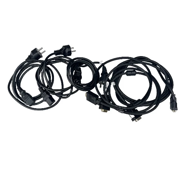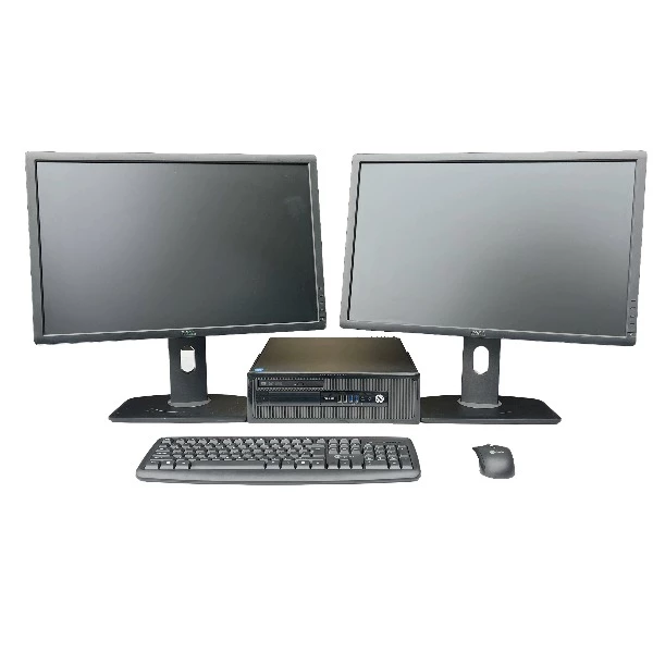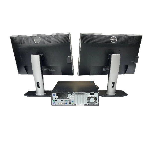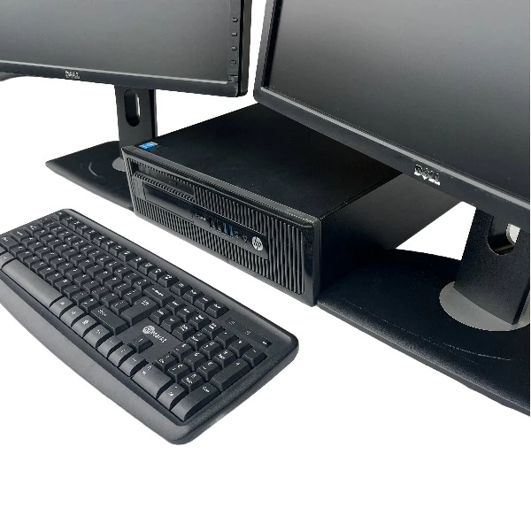 This is a complete desktop workstation consisting of two matte black computer monitors, a compact desktop computer, a keyboard, and a computer mouse. All components feature a functional, neutral design. This set is highly suitable as a prop for furnishing a realistic office, IT, or control room environment. It contributes to an authentic and professional appearance in films, television series, commercials, and events that need to simulate a workspace.
