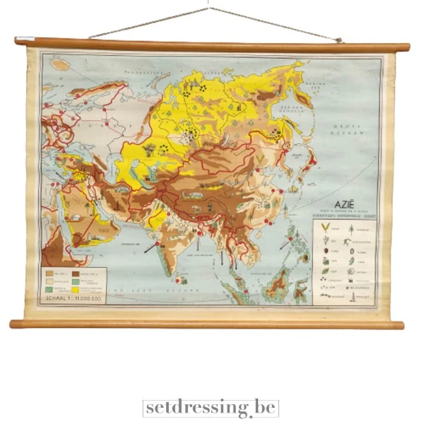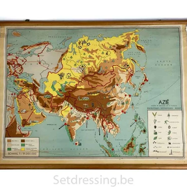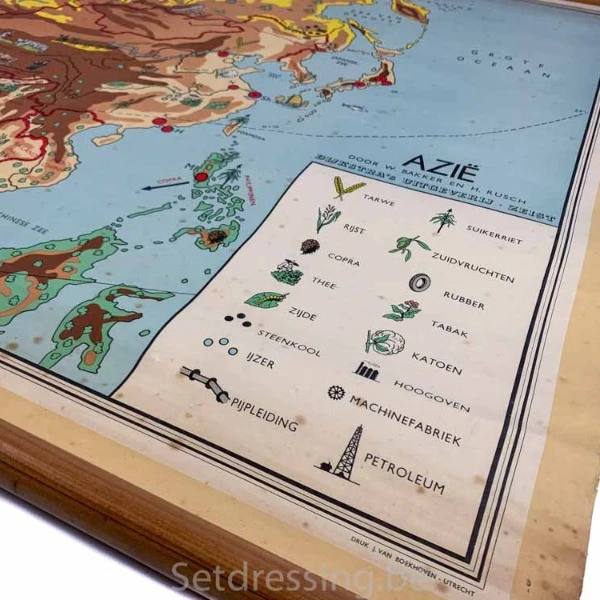 This is a vintage educational school map of Asia, printed on paper with wooden hanging rods. The map displays geographical features, landscapes, and symbolic indications in various colors. It has a weathered, vintage appearance with clear signs of use. Suitable for decorative purposes in sets requiring an educational, geographical, or historical context.