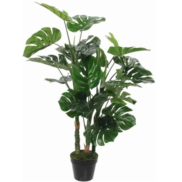 Artificial Monstera plant with large, green leaves featuring distinctive splits. The plant is in a black pot. The material is plastic. Suitable for decorative purposes and creating a tropical atmosphere.