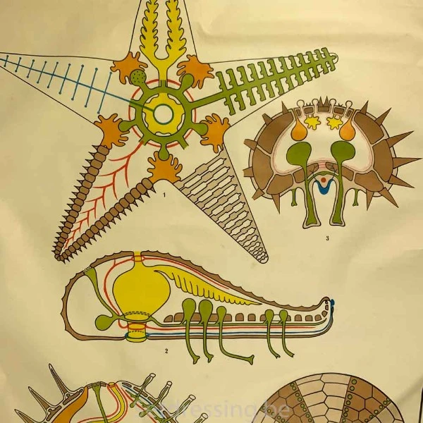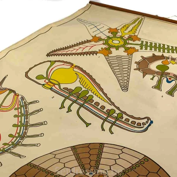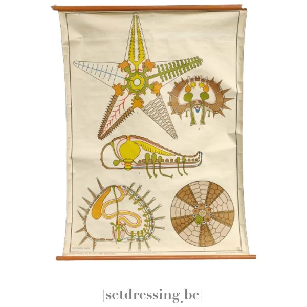 This is a vintage educational school chart with illustrations of sea organisms. The chart is printed on paper with wooden hanging rods and displays detailed, colored drawings of starfish and other marine creatures. It has a weathered, vintage appearance with clear signs of use. Suitable for decorative purposes in sets requiring an educational, biological, or historical context, especially related to marine biology.