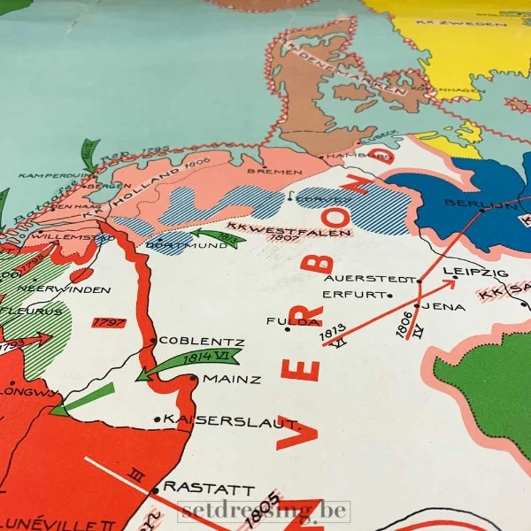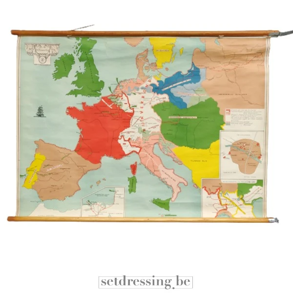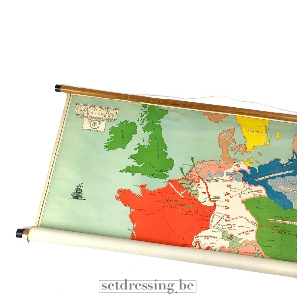 This is a vintage educational school map of Europe during World War I. The map is printed on paper with wooden hanging rods and displays the front lines, political boundaries, and geographical features of Europe during that period. It has a weathered, vintage appearance with clear signs of use. Suitable for decorative purposes in sets requiring a historical, educational, or military context, specifically related to World War I.