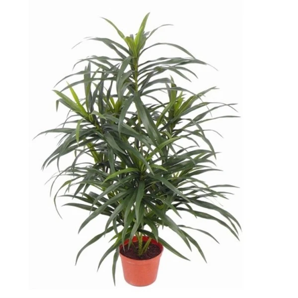 Artificial Dracaena plant with long, narrow, green leaves. The plant is in an orange pot. The material is plastic. Suitable for decorative purposes in various settings.