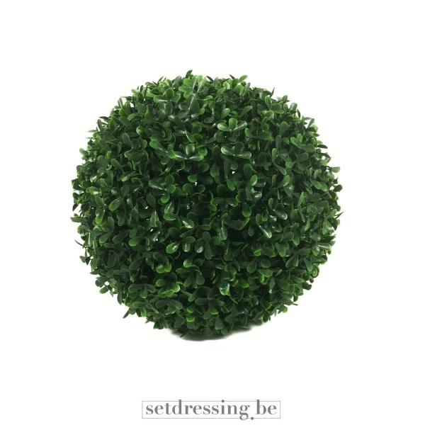 This is an artificial boxwood ball. The ball is made of dark green, synthetic material that resembles boxwood leaves. It has a perfectly round shape and is designed as a decorative element. Suitable for interior sets, events, and photoshoots where a maintenance-free, green accent is desired.