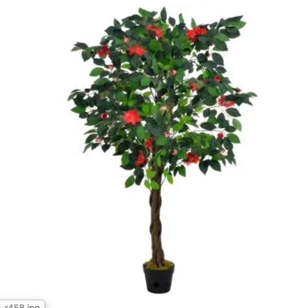 This is an artificial tree in a pot. The tree features a brown trunk with green leaves and red flowers. The leaves and flowers are made of synthetic material. The tree is placed in a black plastic pot. This item is suitable for decorative purposes in interior sets, events, and photoshoots. It requires no maintenance.