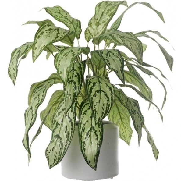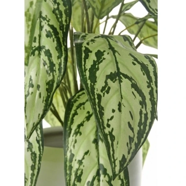 This is an artificial plant. The plant features large, elongated leaves with a grey-green pattern. The leaves are made of synthetic material. This item is designed to be placed in a pot or other decorative element. It is suitable for decorative purposes in interior sets, events, and photoshoots. It requires no maintenance and adds a modern, botanical touch.