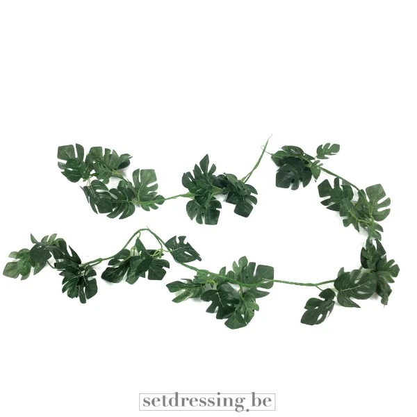 This is an artificial Monstera garland. The garland has dark green leaves with the characteristic holes and indentations of a Monstera plant. The leaves are made of synthetic material and are attached to a flexible, brown stem. The garland is designed as a decorative element for interior sets, events, and photoshoots. It requires no maintenance and adds a tropical, green element to the space.