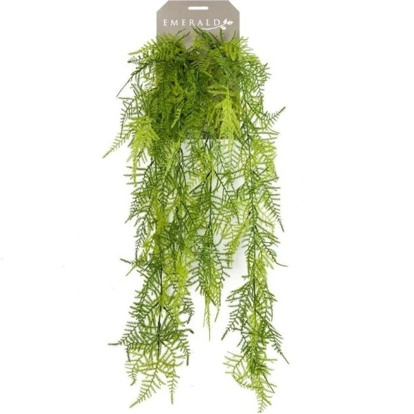 This is an artificial hanging plant, specifically Asparagus Plumosus, with fine, green feathery leaves. The leaves are made of synthetic material. The product is designed to be mounted on a wall or surface. This decorative piece is suitable for interior sets, events, and photoshoots. It requires no maintenance and adds a natural, hanging element to the space.