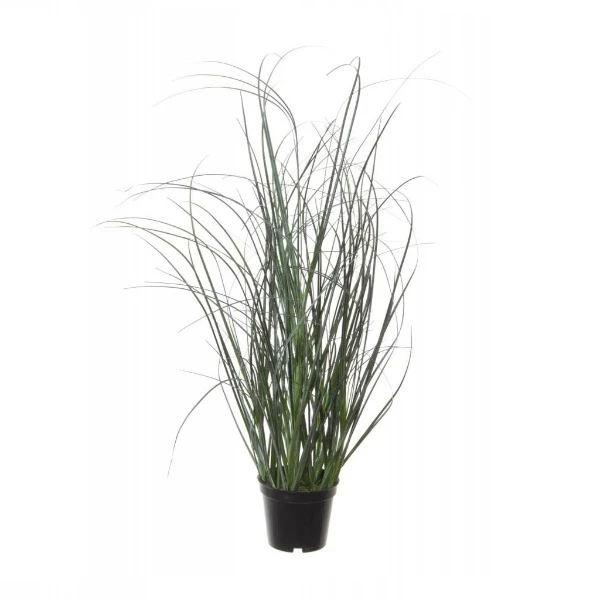 This is an artificial ornamental grass plant in a black pot. The grass features long, thin, dark green blades. Material is plastic. Suitable for decorative purposes, set dressing, or adding a natural element.