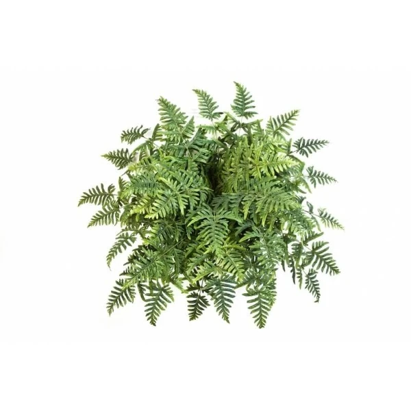 This is an artificial fern with fine, green feathery leaves. The leaves are made of synthetic material. This decorative piece is suitable for interior sets, events, and photoshoots. It requires no maintenance and adds a natural, green element to the space. The plant is designed to be placed on a surface or in a pot.