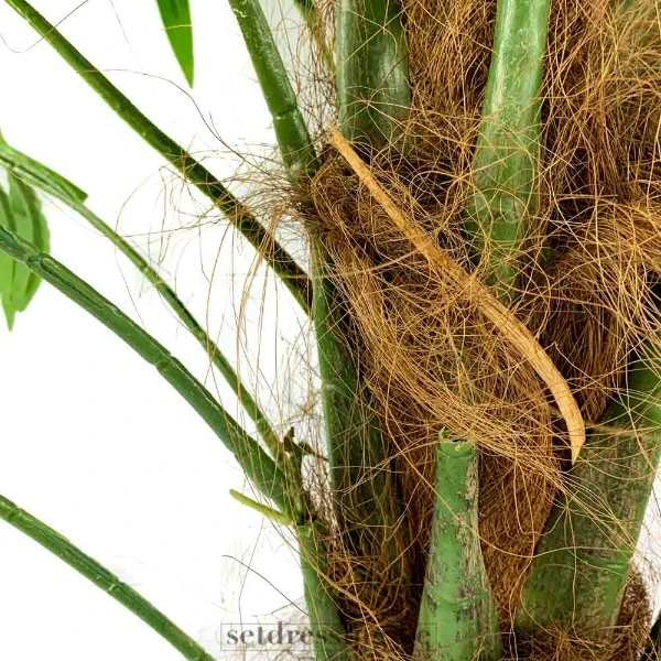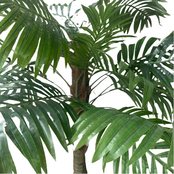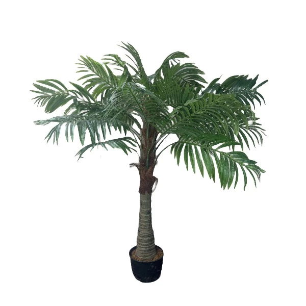 This is an artificial palm tree with wide, green leaves. The leaves are made of synthetic material. The trunk is brown and has a textured surface. The tree is placed in a black plastic pot. This decorative piece is suitable for interior sets, events, and photoshoots. It requires no maintenance and adds a tropical, natural element to the space.