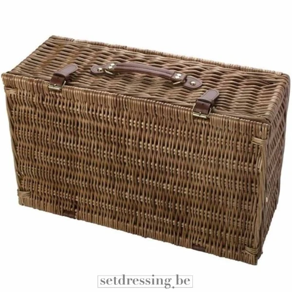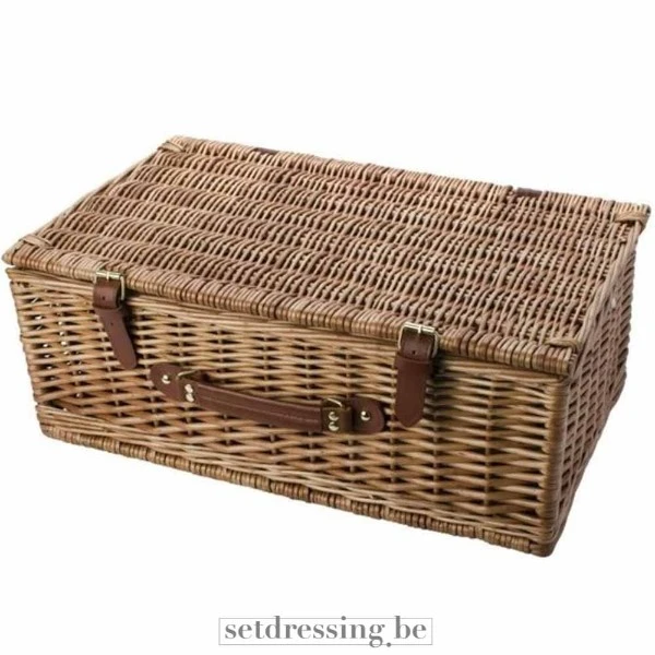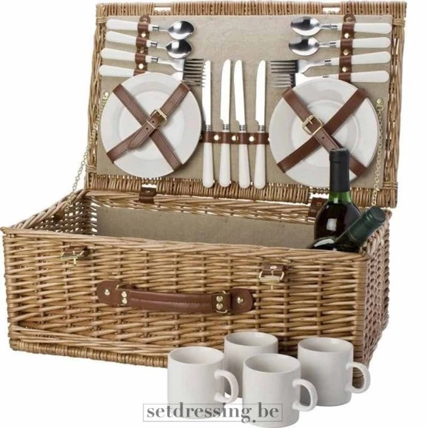 Wicker picnic basket measuring 54 cm wide, fully equipped for four people. The basket includes plates, mugs, knives, forks, and spoons, neatly strapped to the inside of the lid with leather straps. Its sturdy wicker construction and natural brown color give it a charming, rustic appearance. Ideal as a prop for outdoor scenes, picnic moments, or summer settings. Perfect for use on film sets, photo shoots, or events with an outdoor, nature, or family theme. Suitable for both indoor and outdoor use.