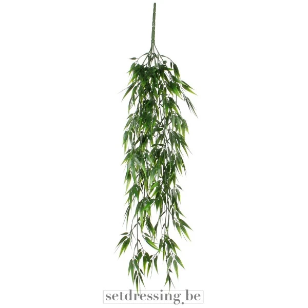 This artificial hanging bamboo branch is a decorative element for various settings. The branch is made of plastic and features a natural-looking green color. The leaves are narrow and elongated, creating a realistic bamboo effect. Suitable for creating a tropical or oriental atmosphere in sets, photoshoots and events.