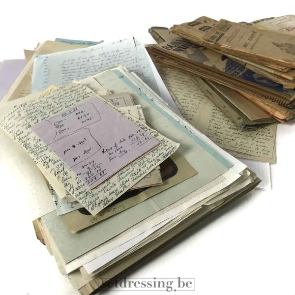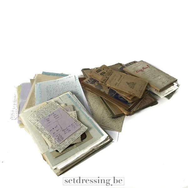 Authentic collection of old documents and letters, perfect for use as props or decoration in films, theater productions, or photoshoots. This set includes a mix of handwritten letters, typed documents, and aged papers, all featuring a vintage, weathered look. Ideal for creating a historical ambiance or adding realism to any scene. Delivered in a box containing various paper formats and styles. For indoor use only.