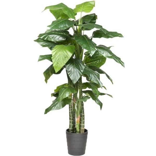 Artificial plant with large, green leaves. The plant is in a black pot. The material is plastic. Suitable for decorative purposes in various settings.
