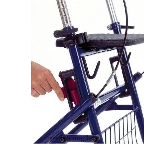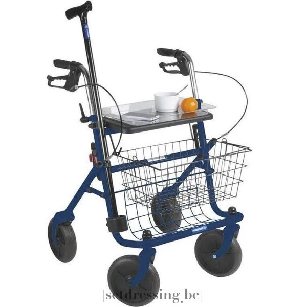 This is a dark blue rollator with a silver-colored tray and a metal basket. The rollator's frame is made of metal, and the handles are equipped with brakes. The wheels are black, and the rollator is fitted with a seat and a basket for carrying items. This functional mobility aid is ideal for scenes depicting old age, recovery, or medical contexts. It can be used in hospitals, home settings, or public spaces.