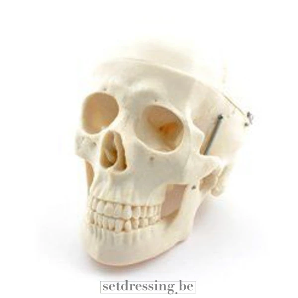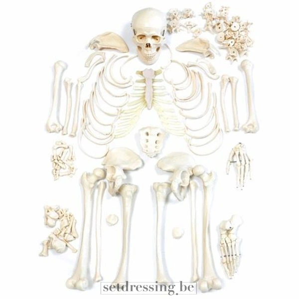 This is a model of a human skeleton. The bones are made of plastic in an off-white finish, mimicking the natural color of bones. The set includes all major bones of the human body, from the skull to the bones of hands and feet. This realistic anatomical model is ideal for educational scenes, medical settings, forensic dramas, or as a striking decorative element in themed events.