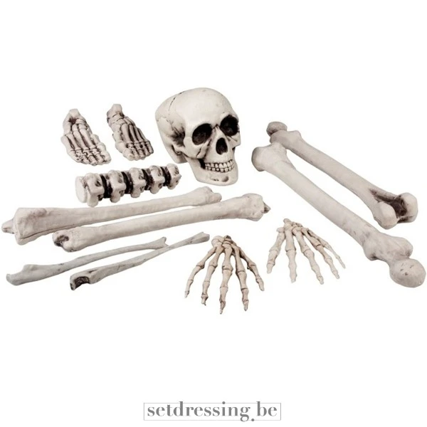 This is a set of plastic skeleton bones in an off-white finish. The collection includes a skull, various long bones (such as femurs and arm bones), ribs, and fragments of hands and feet. The bones feature realistic texture and shape, making them suitable for various applications. This set is ideal for Halloween decorations, spooky scenes in films or photoshoots, educational purposes, or as props in theater productions requiring a macabre or medical theme.