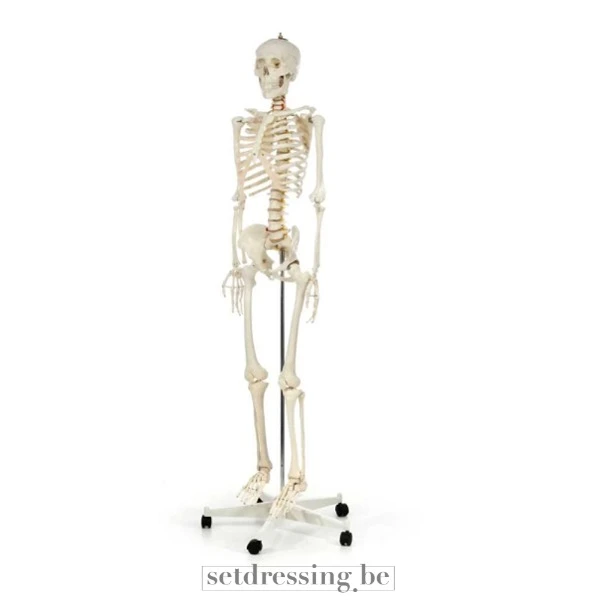 This is a life-size human skeleton model, mounted on a mobile stand. The skeleton is made of plastic with an off-white finish, mimicking the natural color of bones. The joints are articulated, allowing for various poses. The stand is made of metal with wheels for easy movement. This realistic anatomical model is ideal for educational settings, medical drama scenes, Halloween decorations, or as a prominent visual element in exhibitions or events.