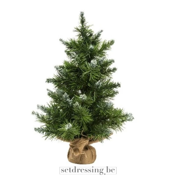 This artificial mini Christmas tree is a decorative element for festive settings. The tree is made of plastic and features a dark green color with white accents that mimic snow. The tree is placed in a burlap sack as a base. Suitable for creating a Christmas atmosphere in sets, photoshoots and events.