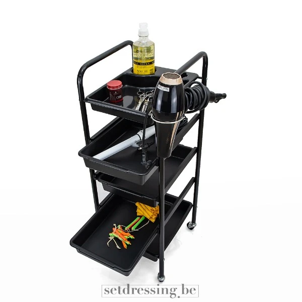 Black hairdresser trolley, 90cm high, made of durable metal with multiple trays and compartments. The practical layout allows easy organization of all your hairdressing tools, making it perfect for use in salons or on set. Equipped with wheels for easy mobility and a dedicated holder for a hairdryer or bottles. Designed for professional indoor use.