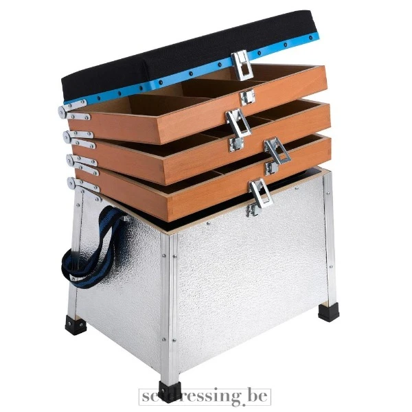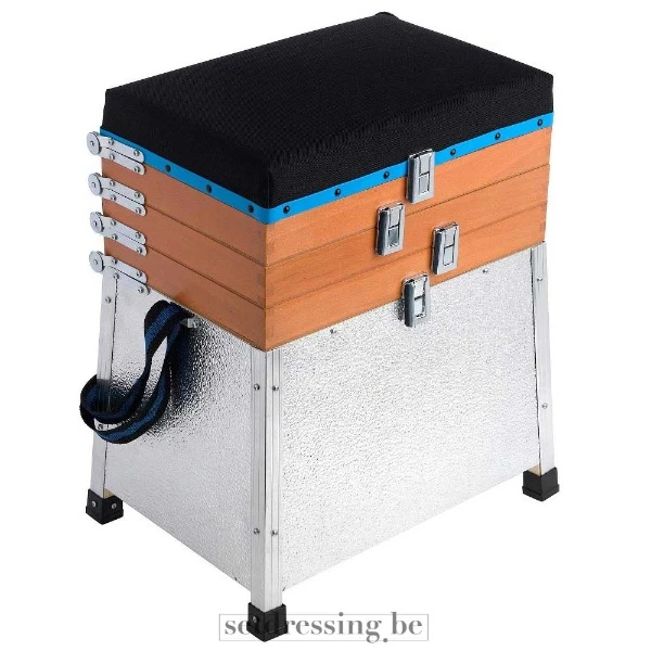 This fishing seat box is a functional prop with multiple storage compartments. The box features a brown wooden top with a blue trim, beneath which are three pull-out drawers with metal clasps. The seating area is upholstered in black textile, providing comfort. The base is made of silver-colored, textured metal. A blue and black carrying strap is attached to the side. This object is suitable for adding an authentic or recreational ambiance to various productions.