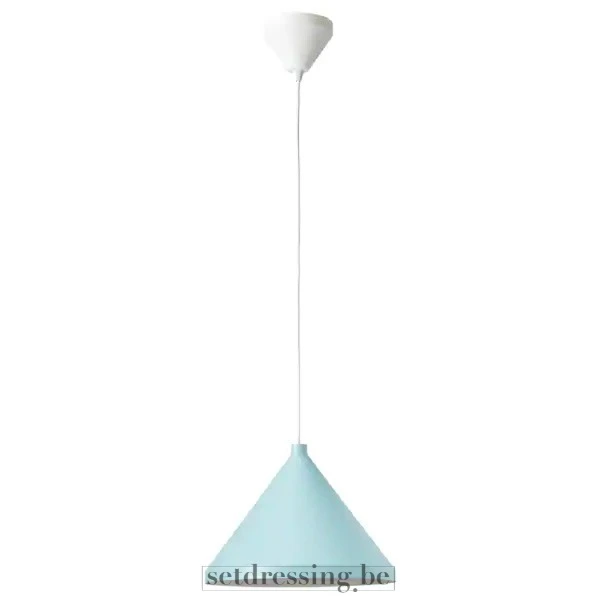 Dit is een moderne hanglamp met een conische kap in een lichtblauwe kleur. Het hangt aan een slanke witte kabel, verbonden met een witte plafondkap. De lampenkap is gemaakt van metaal en heeft een gladde, matte afwerking. Het minimalistische en strakke ontwerp maakt het geschikt voor eigentijdse of Scandinavisch geïnspireerde interieurs. Dit object dient als een eenvoudige maar effectieve verlichtingsprop, ideaal voor het toevoegen van een subtiele kleuraccent en moderne esthetiek aan eetzones, keukens of woonruimtes in film-, fotografie- en evenementenomgevingen.