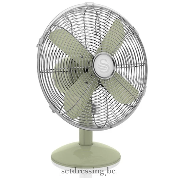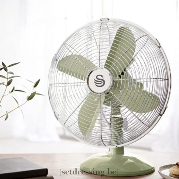 Dit is een bureauventilator in retrostijl met een lichtgroene afwerking en een chroomkleurig rooster. De ventilator heeft een klassiek ontwerp met zichtbare bladen en een stevige voet. Het is geconstrueerd van duurzame metalen componenten, wat zorgt voor een robuuste en authentieke vintage uitstraling. Dit rekwisiet is geschikt voor diverse periode-specifieke settings of om een vleugje retrocharme toe te voegen aan eigentijdse scènes. Het compacte formaat maakt het veelzijdig voor plaatsing op bureaus, tafels of planken, en dient als functioneel of decoratief element.