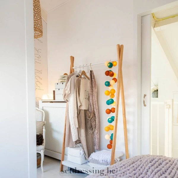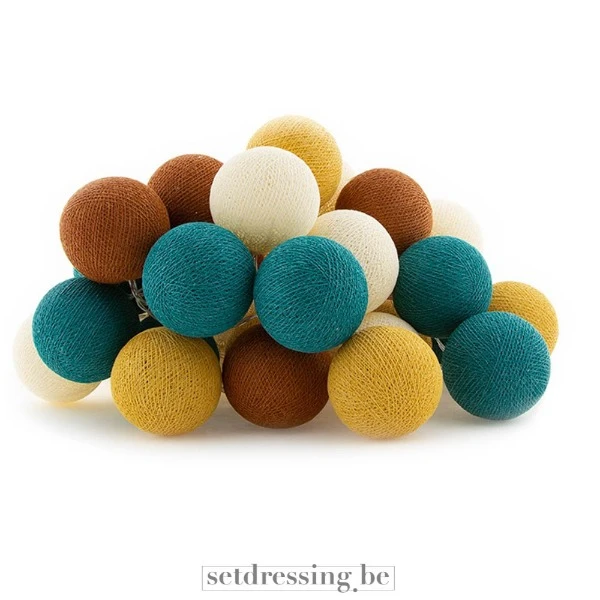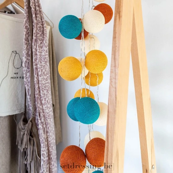 Dit is een lichtslinger samengesteld uit meerdere katoenen bollen in diverse aardse en levendige tinten, waaronder petrolblauw, mosterdgeel, crème en terracotta. Elke bol is gemaakt van een vezelachtig materiaal, en bevat een interne lichtbron, wat zorgt voor een zachte, diffuse gloed. De bollen zijn gerangschikt langs een discrete draad, waardoor een decoratieve lichtslinger ontstaat. Dit object biedt een gezellige en speelse esthetiek. Het is geschikt voor het creëren van warme sfeerverlichting of een feestelijke sfeer. Deze prop is ideaal voor slaapkamers, kinderkamers, evenementdecoraties of gezellige interieurscènes in film, fotografie en evenementen.