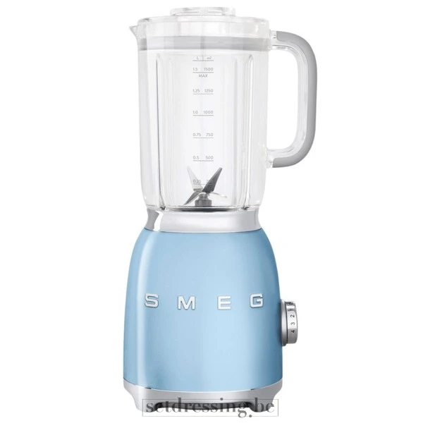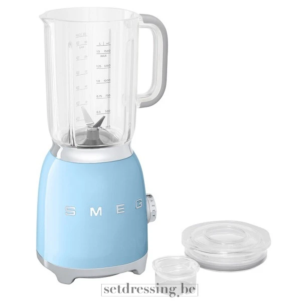 Dit is een moderne retro-stijl blender met een pastelblauwe basis en een doorzichtige glazen kan. Het ontwerp kenmerkt zich door een gepolijste chroom-look afwerking en een bedieningsknop aan de zijkant. Dit apparaat is een uitstekend rekwisiet voor hedendaagse keukenopstellingen, lifestyle fotoshoots, of evenementen die een vleugje moderne vintage esthetiek vereisen. De kenmerkende kleur en herkenbare merkstijl maken het een visueel aantrekkelijke en authentieke toevoeging aan diverse scène-opstellingen.