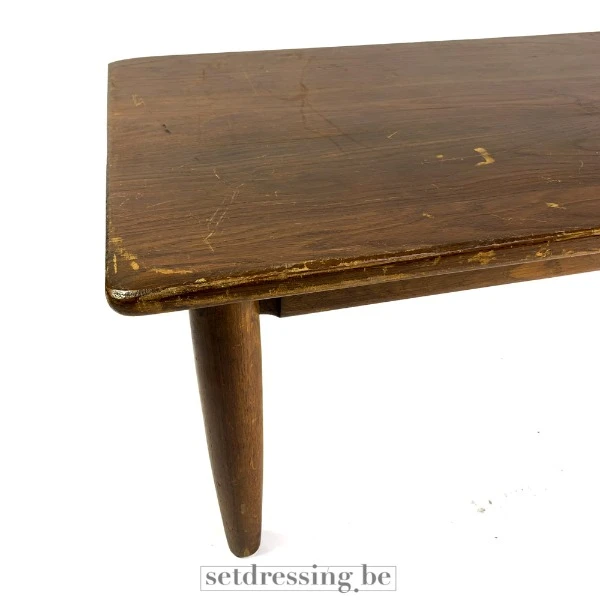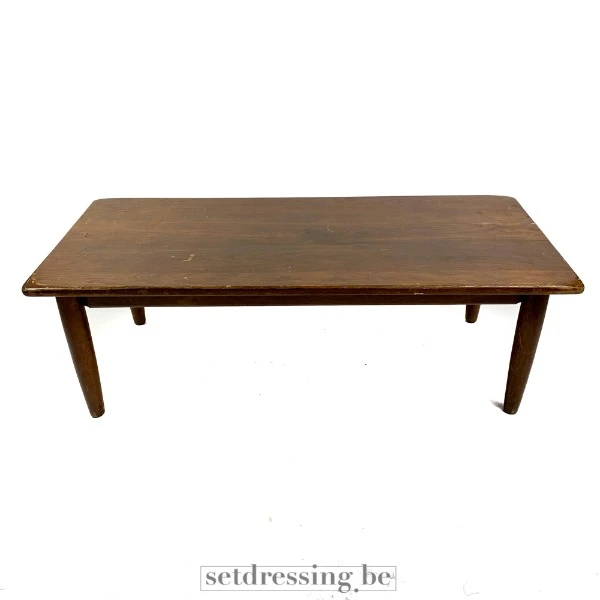 Grote bruine houten salontafel van 130cm breed. Het rechthoekige tafelblad heeft een klassieke donkerhouten afwerking, ondersteund door stevige, licht taps toelopende poten. Met zichtbare gebruikssporen brengt deze tafel een vintage uitstraling in elke setting. Ideaal voor filmsets, fotoshoots en eventstyling. Enkel geschikt voor binnengebruik.