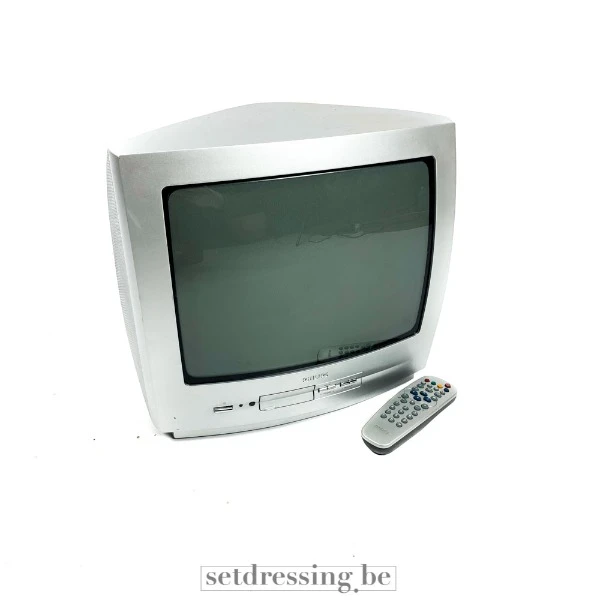 Dit is een compacte, zilverkleurige kathodestraalbuis (CRT) televisie, kenmerkend voor modellen uit de late 20e of vroege 21e eeuw. Het beschikt over een vierkant, licht gebogen scherm en een zilveren kunststof behuizing met geribbelde zijkanten. Het voorpaneel bevat zichtbare ingangen, waarschijnlijk voor composiet video, en basisbedieningsknoppen. Een bijpassende zilveren afstandsbediening is inbegrepen. Gemaakt van plastic en glas, is deze vintage televisie een ideaal rekwisiet voor het creëren van authentieke periode decors in film, televisieseries, retro gaming opstellingen, of elke scène die een ouder elektronisch apparaat vereist om een specifieke tijdperk over te brengen.